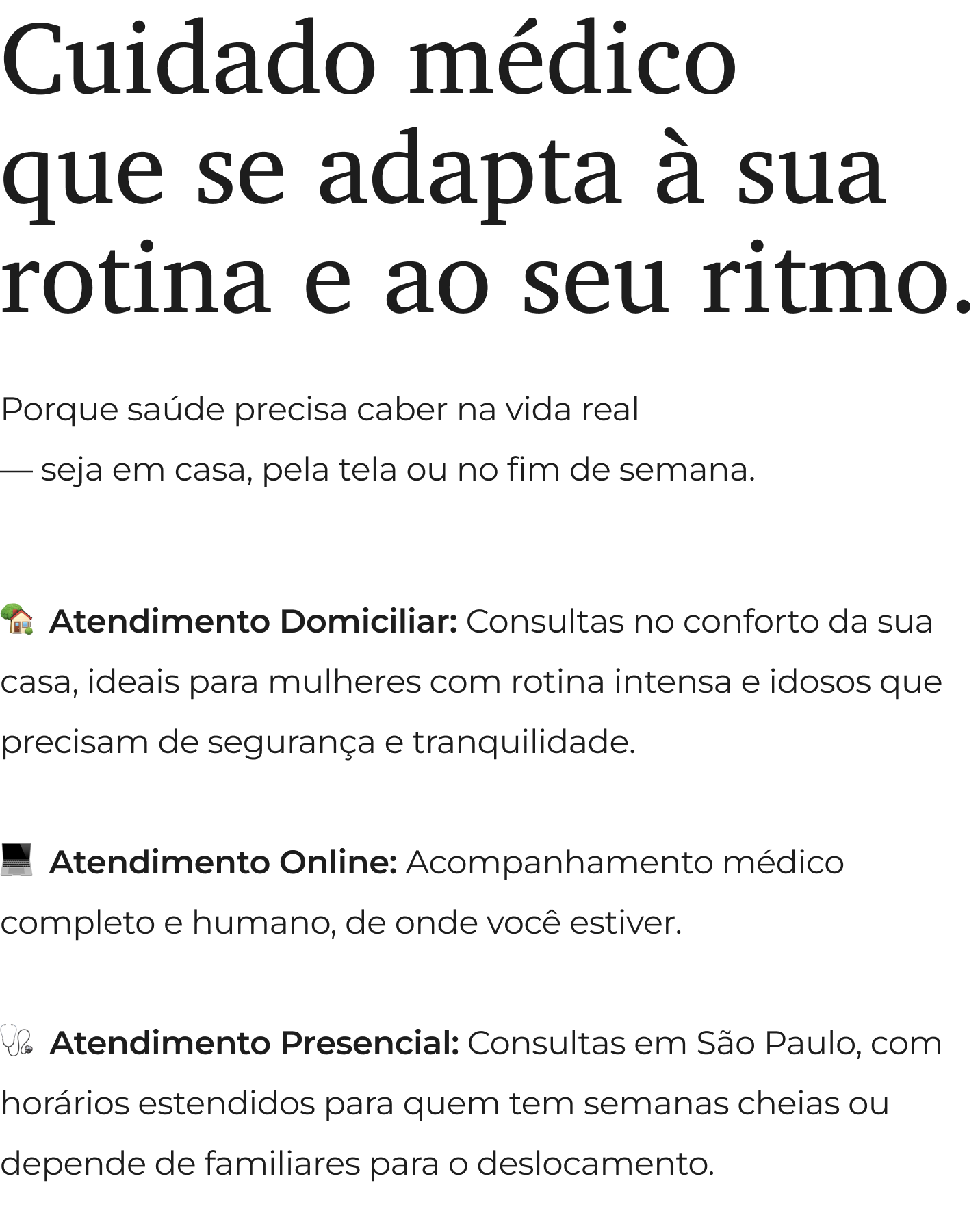 Atendimento médico humanizado – online, domiciliar e presencial (inclusive aos sábados) pensado para mulheres maduras e pacientes idosos que buscam saúde, autonomia e equilíbrio.